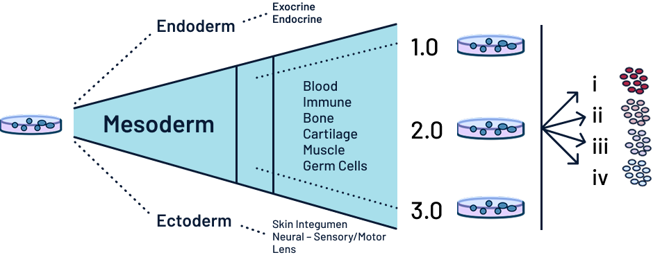 Route from cultured pluripotent stem cells to differentiation of germinal mesodermal lineages and then primal mesenchymal stromal cells before adult cells and tissues form. Variants of these (1.0, 2.0, 3.0, etc) can be made and factors released from them into culture media can be isolated as different fractions (i, ii, iii, iv, etc).