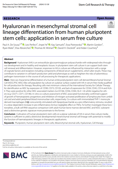Our technology is based on our research on the role of hyaluronan in stem cell differentiation. This is a sugar polymer with wide spread roles in organ development, function and disease that depend on how it is presented to cells and other factors that interact with it. In our most recently peer reviewed study published in Stem Cell Research & Therapy, we report how it is sufficient to make distinctive primal mesenchymal stromal cells, we call Stromacytes, capable of modifying the function of blood cell lineages in the same way as adult organ derived cells.