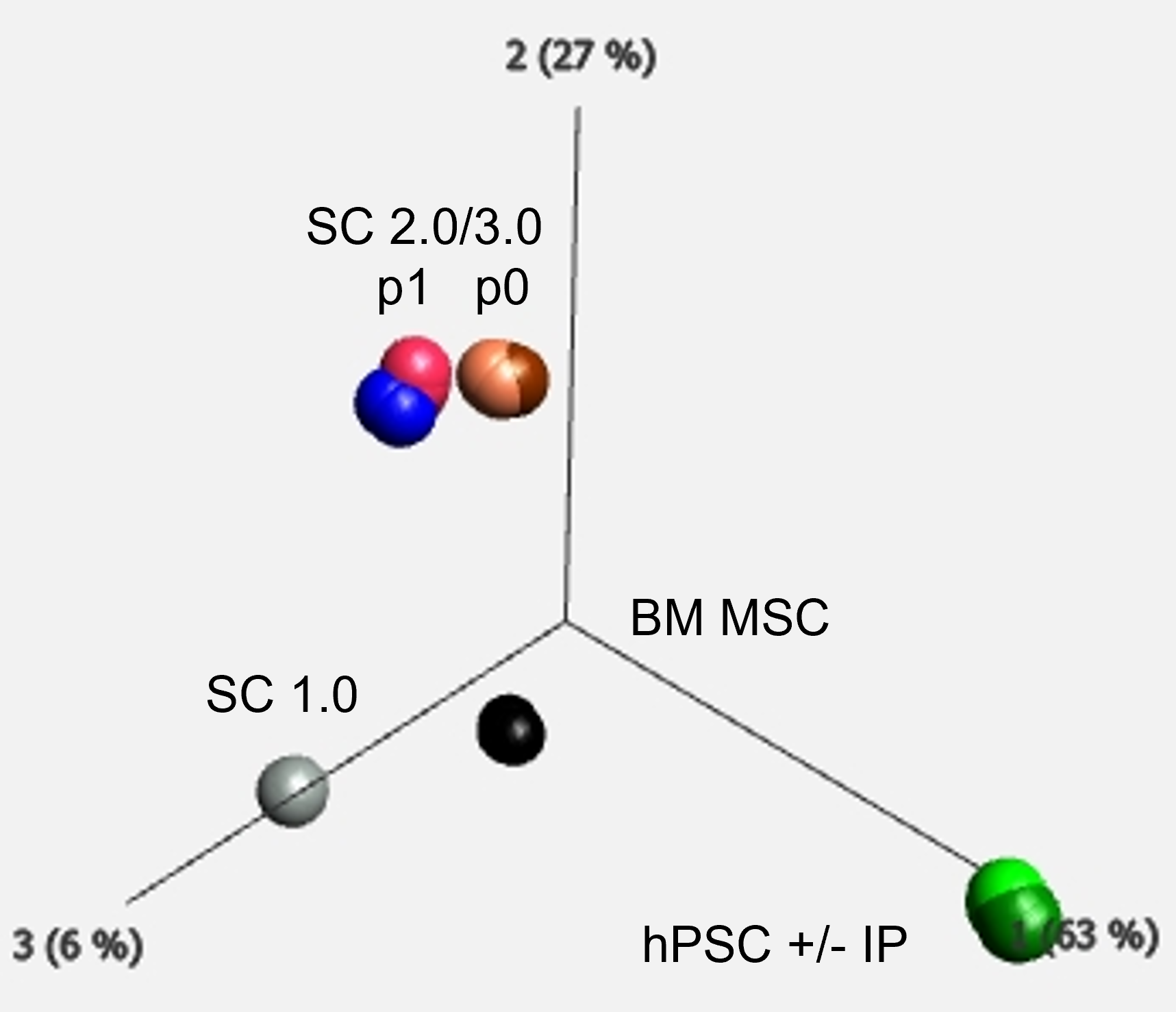 Characterisation of cell gene expression by Principal Component Analysis of all expressed genes assessed by Total RNA sequencing in Stromacyte variants (SC 1.0, 2.0, 3.0) at designated passage (p) in culture, differing in how hyaluronan is presented by our original (1.0) and new intellectual proprietary (SC3.0 and +IP hPSC) vs state of the art (SC2.0 and -IP hPSC) methods applied to human pluripotent stem cells (hPSC), and also compared with human bone marrow mesenchymal stromal cells (BM MSC). Analysis performed using Qlucore Informatics Tools.